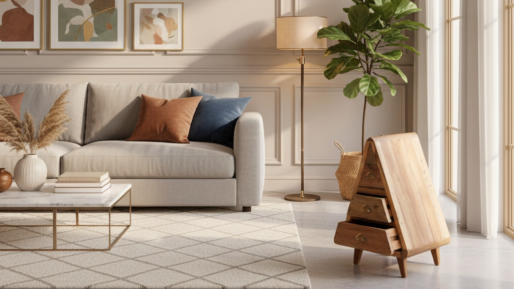 Design: Unique triangular silhouette that works as both a functional storage piece and a decorative focal point.