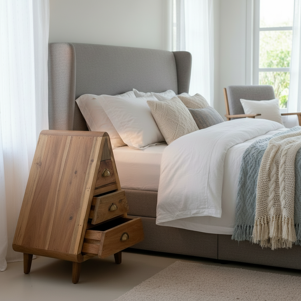 This Triangle Decoration Storage Unit with 3 drawers is a distinctive, design-led piece for style-conscious homes. Handcrafted in Bali using mostly upcycled teak wood reclaimed from retired fishing boats, it brings together sustainable materials, practical storage and sculptural form.