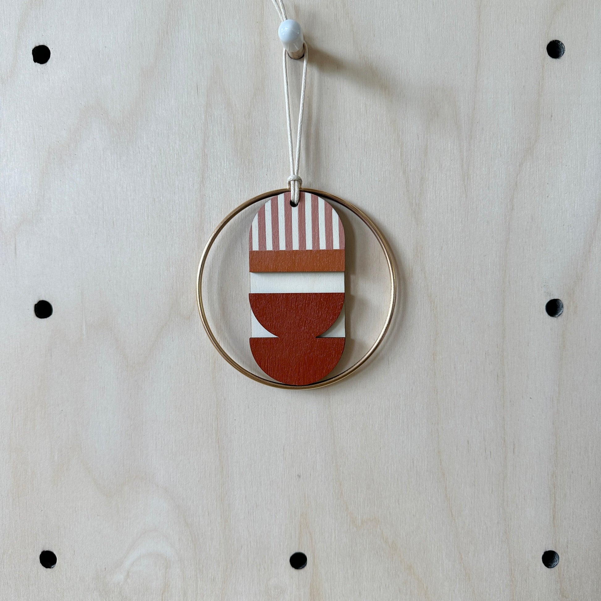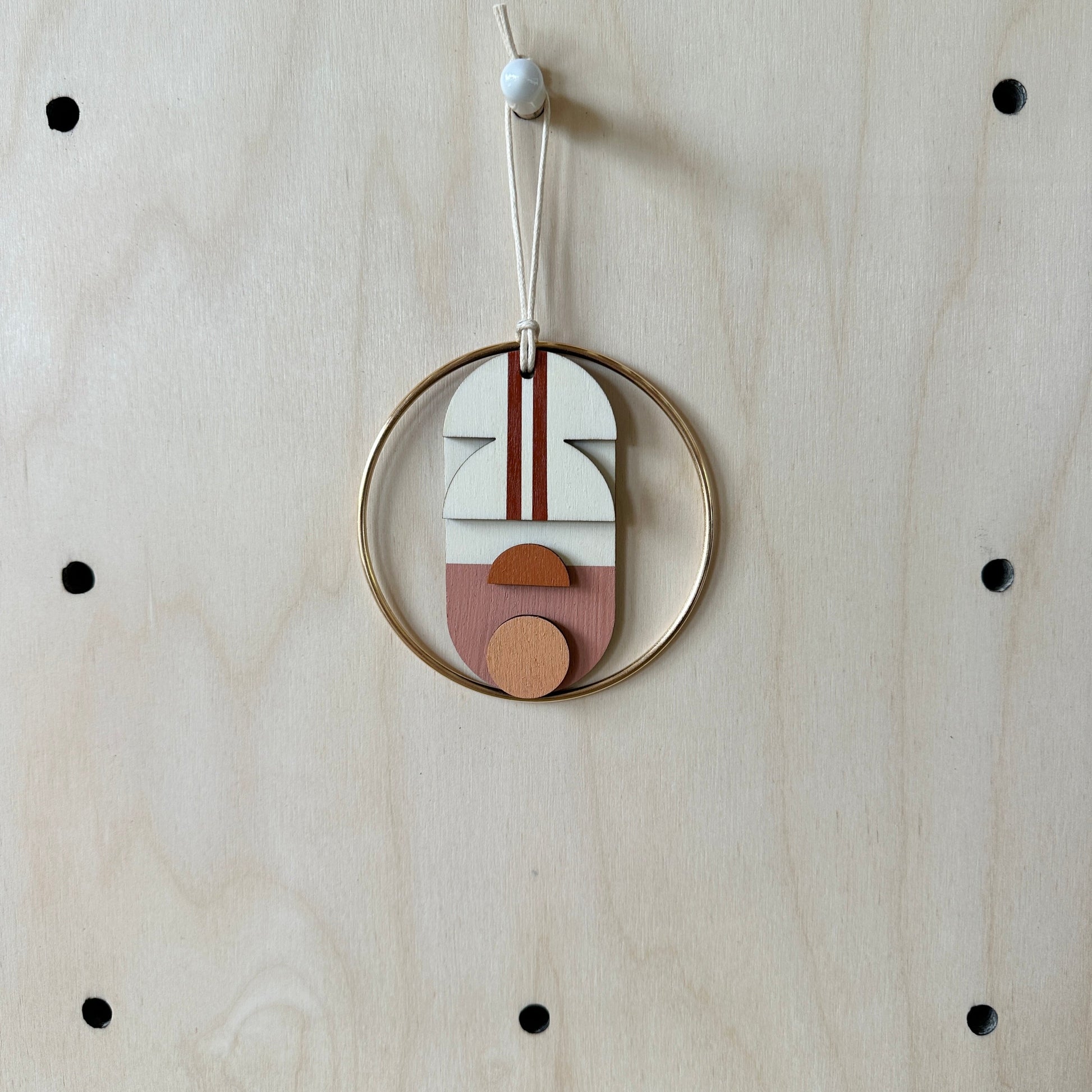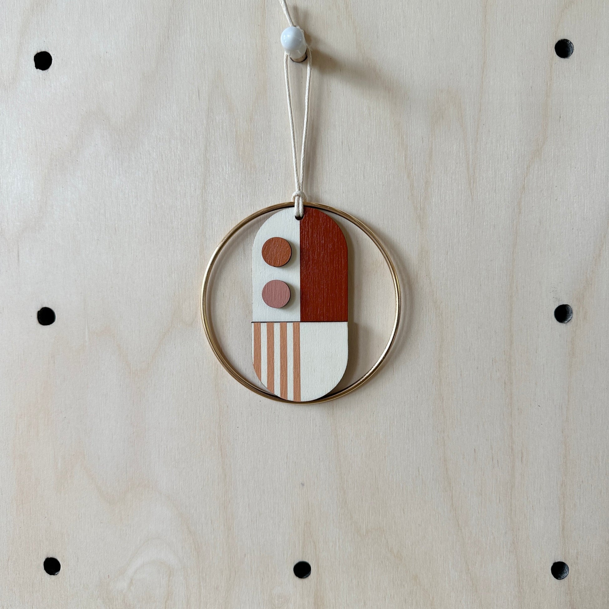 Lovingly handmade modern mini wall art. These decorations are made from plywood, paint, metal and waxed cord. The colours used are warm pinks and reds with gold. This mini wall hanging would make a beautiful addition to any room to create a modern mid-century feel. Made from sustainable plywood, hand painted and constructed in Milton Keynes, England.